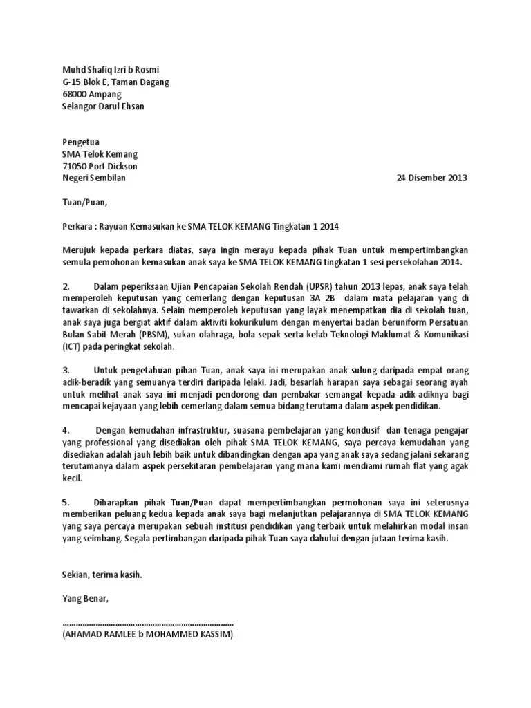 Surat rasmi permohonan jalan berturap rasmi sua karena itu sudah saatnya diperbaiki. Saya juga ada melampirkan sekali satu salinan surat rasmi tawaran ke sbp daripada kpm yang dikeluarkan oleh pengurusan sekolah berasrama penuh . Ramai emak ayah yang hendak anaknya masuk ke sekolah berasrama penuh mrsm. Contoh surat rayuan permohonan kemasukan ke sekolah menengah teknik/kolej vokasional (nama pelajar) (alamat rumah) pengetua kolej vokasional……./sek… Tulis menggunakan format surat kiriman rasmi. Contoh surat rayuan kolej vokasional dan smt 2022, cara buat appeal letter jika gagal mendapat tawaran kv.